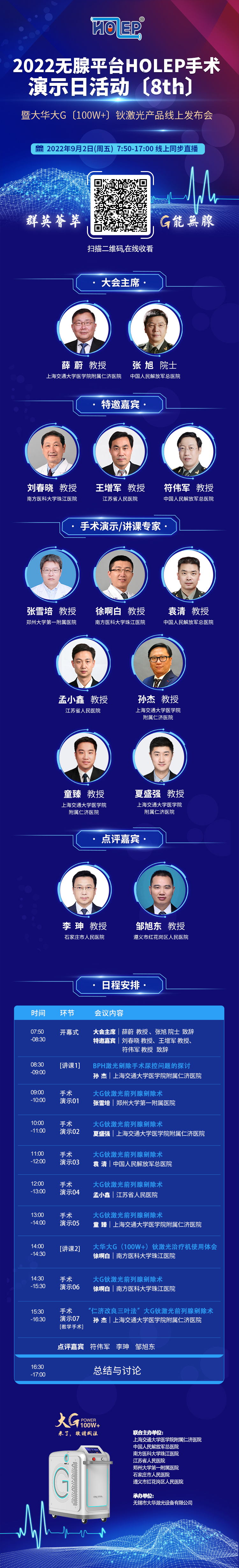 由上海交通大學醫學院附屬仁濟醫院、中國人民解放軍總醫院、南方醫科大學珠江醫院、江蘇省人民醫院、鄭州大學第一附屬醫院、石家莊市人民醫院、遵義市紅花崗區人民醫院7家單位聯合主辦,無錫市大華激光設備有限公司承辦的“第8期無腺平臺HoLEP手術演示日”活動將于2022年09月02日(周五)7:50正式啟航。