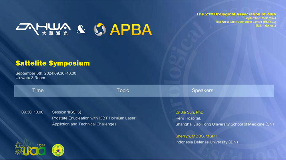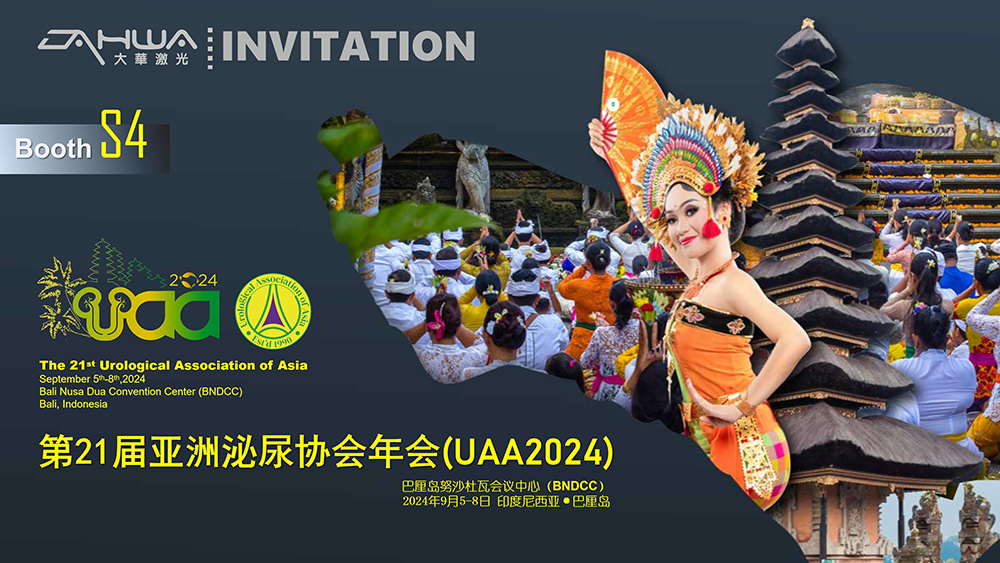 The 21st Annual Conference of the Asian Urology Association (UAA2024) will be grandly held from September 5th to 8th, 2024 at the Nusa Dua Convention Center (BNDCC) in Bali, Indonesia. As a leading manufacturer of medical laser equipment and a leader in overall solutions for urology equipment in China, Dahwa Laser Company will bring excellent "Intelligently made in China" medical equipment to the exhibition, and work together with international partners to promote the development and progress of urology in Asia!